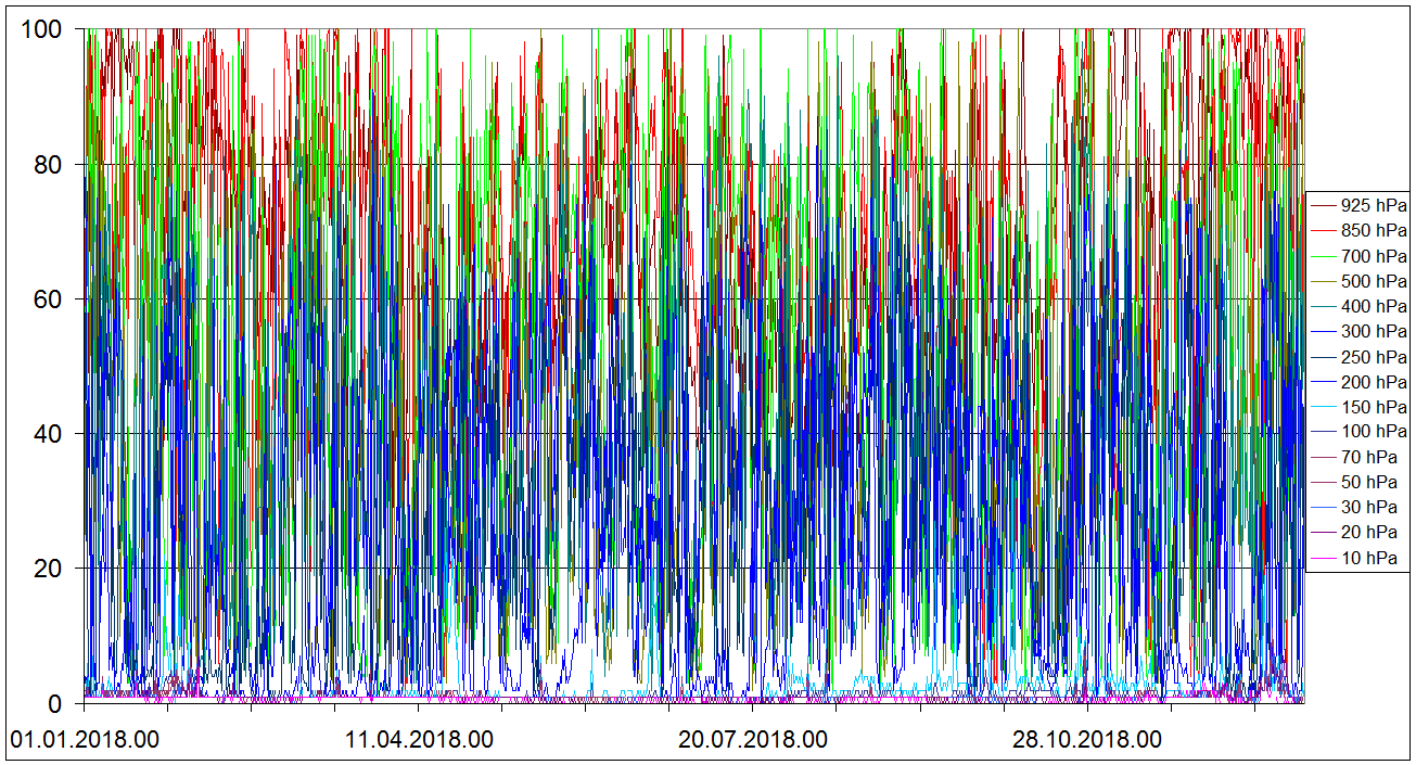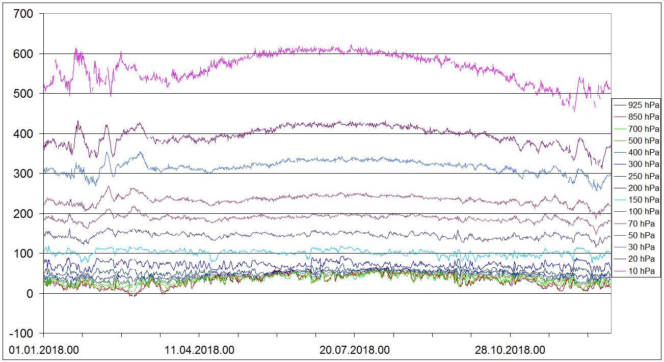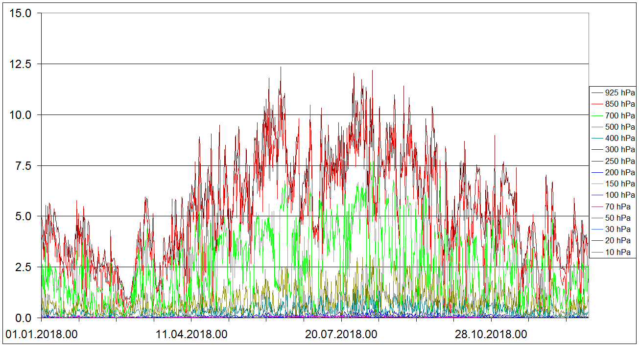 Sondaze Praha Libus 2018 - hodnoty velicin v 15 standardnich hladinach - 925 hPa, 850 hPa, 700 hPa, 500 hPa, 400 hPa, 300 hPa, 250 hPa, 200 hPa, 150 hPa, 100 hPa, 70 hPa, 50 hPa, 30 hPa, 20 hPa, 10 hPa. Jedna se o graf ze vsech 1095 sondazi (kazdy den 00 06 12 UTC). V nekterych terminech muzou nektere hodnoty chybet, a to zejmena ve vyssich hladinach, nejcasteji chybi hodnota v 10 hPa, v 10 hPa nemam smer vetru.