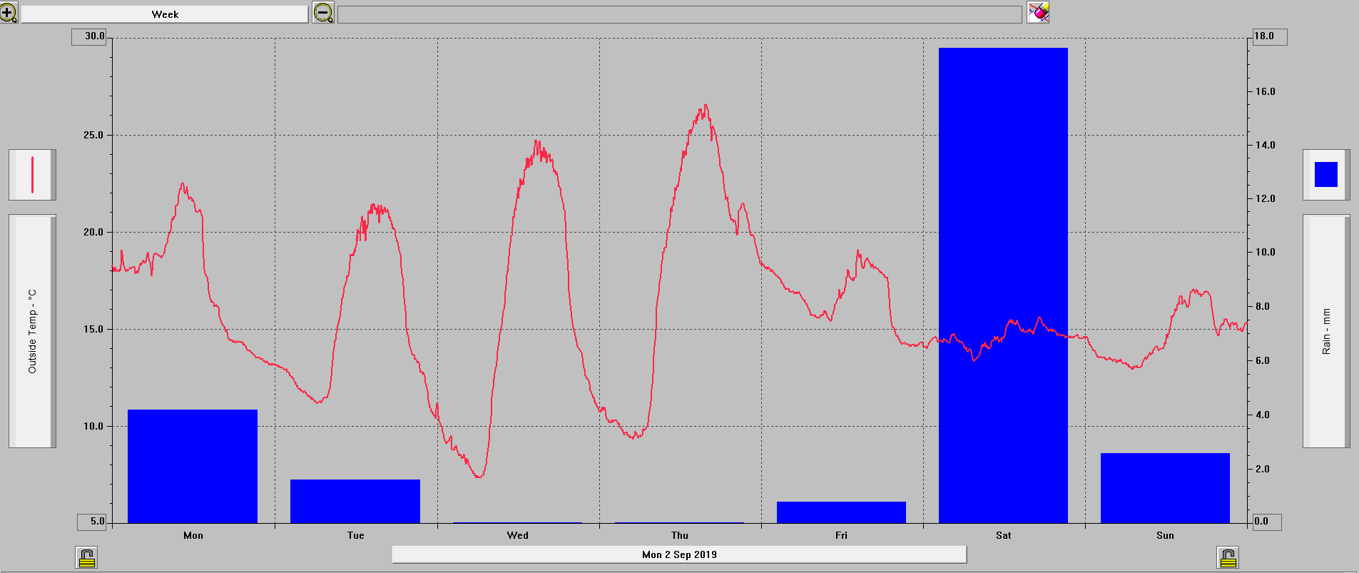Minimální/ maximální teplota ve 2 m za 24h: 13,3 °C (7.; 07:31)/ 18,2 °C (6.; 16:55)