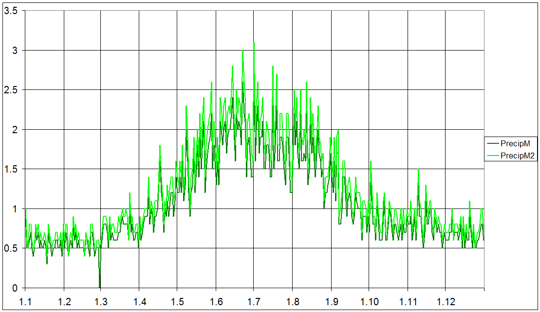PrecipM - prumerne denni srazky pro dany den v roce, za obdobi 1805-2004. Dale je graf z nejvyssimi dennimi srazkami pro toto obdobi.