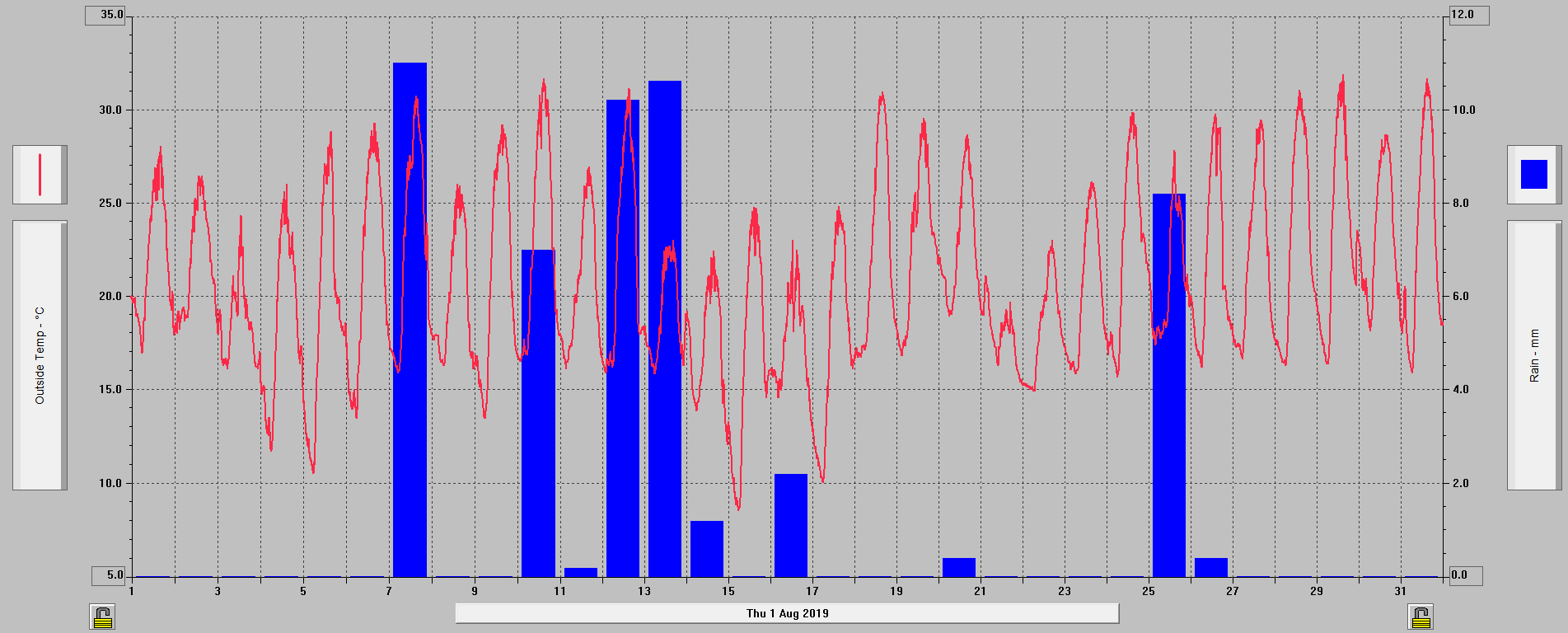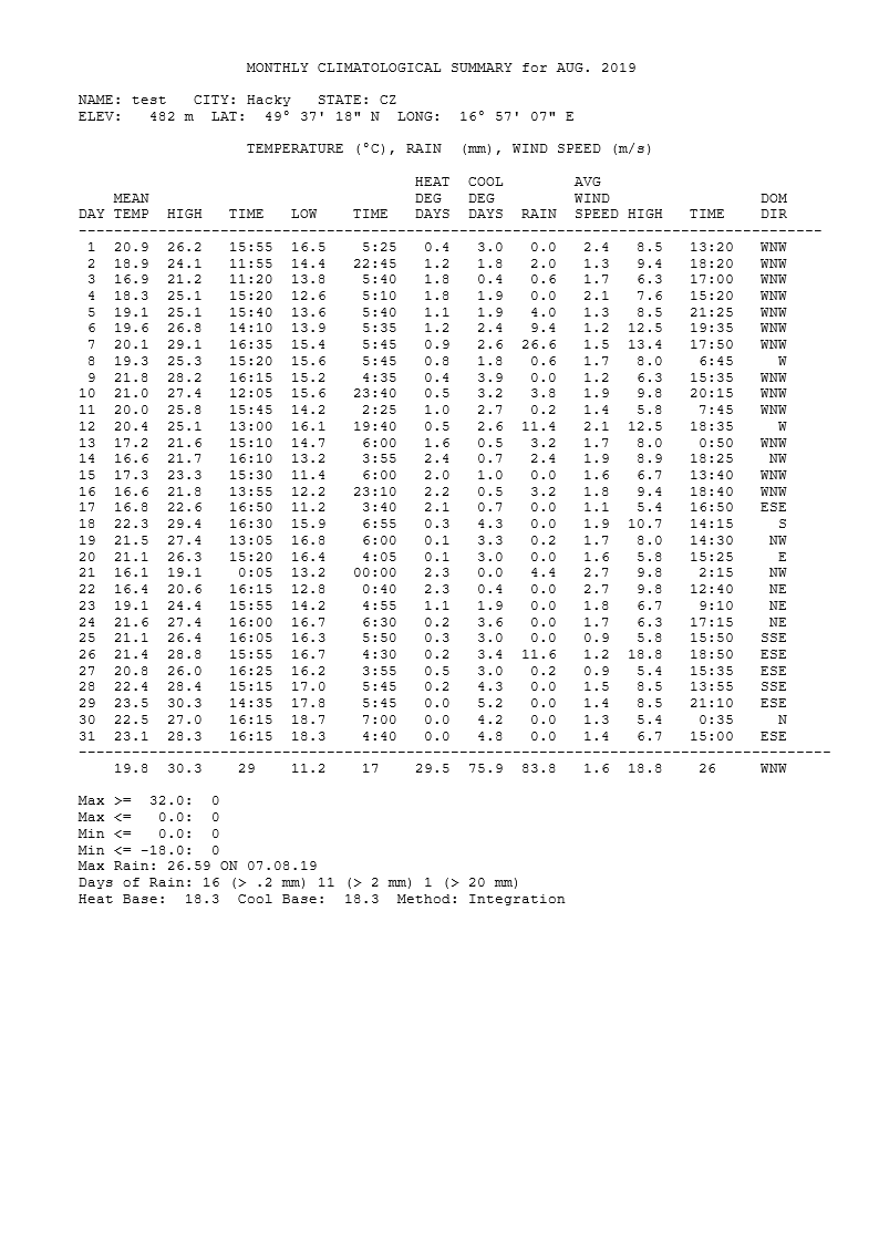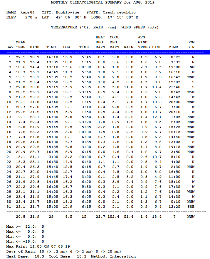 - absolutně nejvyšší teplota byla dosažena ve dnech 26. a 29.8. + 30,7°C ve 14:05, resp. 15:10 SELČ
