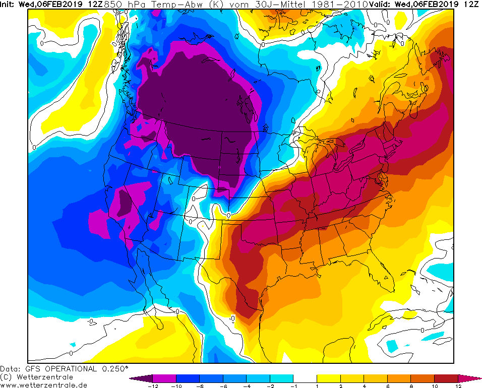 I dalsi dny budou zajimave. Aktualne jsou v severni Americe dve rozsahle oblasti s extremnim nadprumerem a extremnim podprumerem (odchylka od normalu vic nez +12 °C a mene nez -12 °C). A to se jedna o rozsahle oblasti.