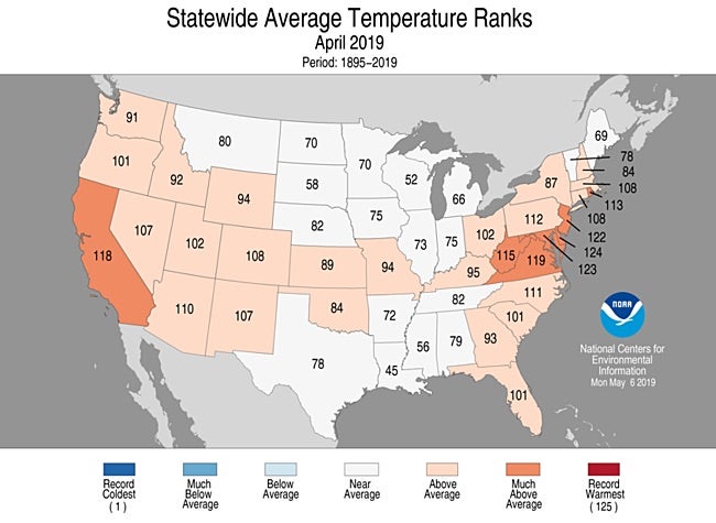 Duben 2019 v USA, v jednotlivych statech - anomalie teplot a srazek.