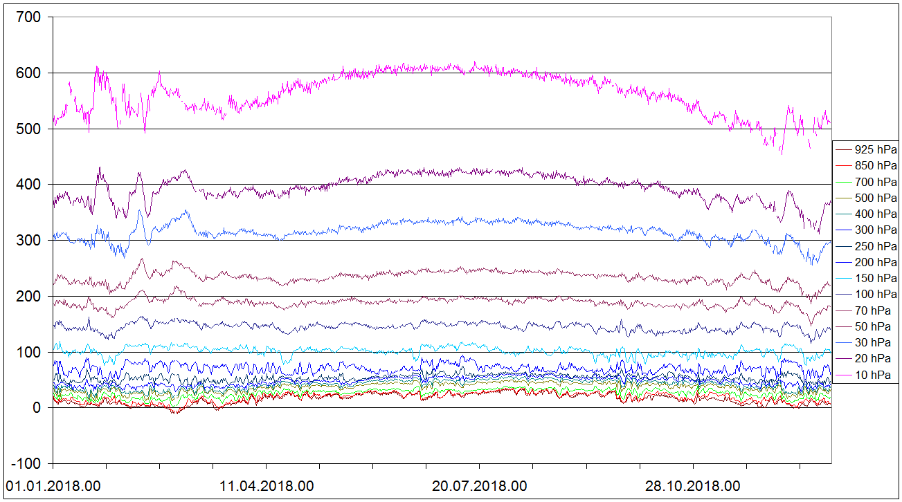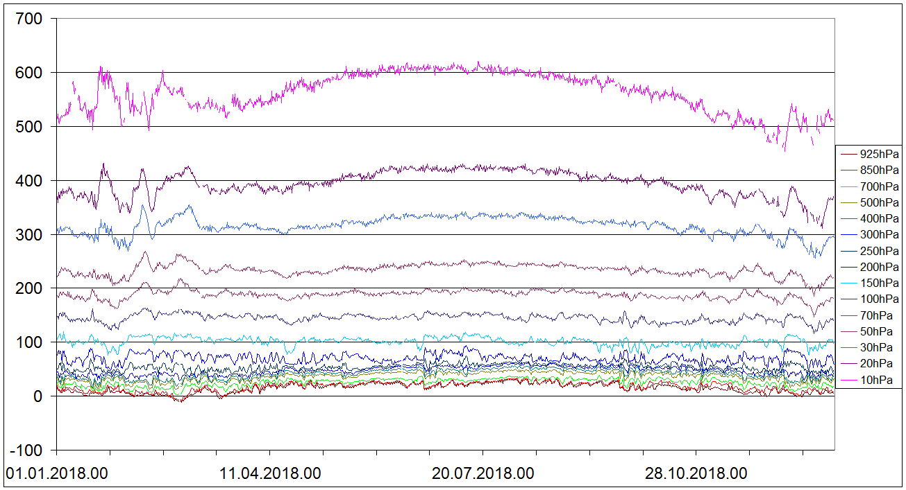 Sondaze Praha Libus 2018 - hodnoty velicin v 15 standardnich hladinach - 925 hPa, 850 hPa, 700 hPa, 500 hPa, 400 hPa, 300 hPa, 250 hPa, 200 hPa, 150 hPa, 100 hPa, 70 hPa, 50 hPa, 30 hPa, 20 hPa, 10 hPa. Jedna se o graf ze vsech 1095 sondazi (kazdy den 00 06 12 UTC). V nekterych terminech muzou nektere hodnoty chybet, a to zejmena ve vyssich hladinach, nejcasteji chybi hodnota v 10 hPa, v 10 hPa nemam smer vetru.