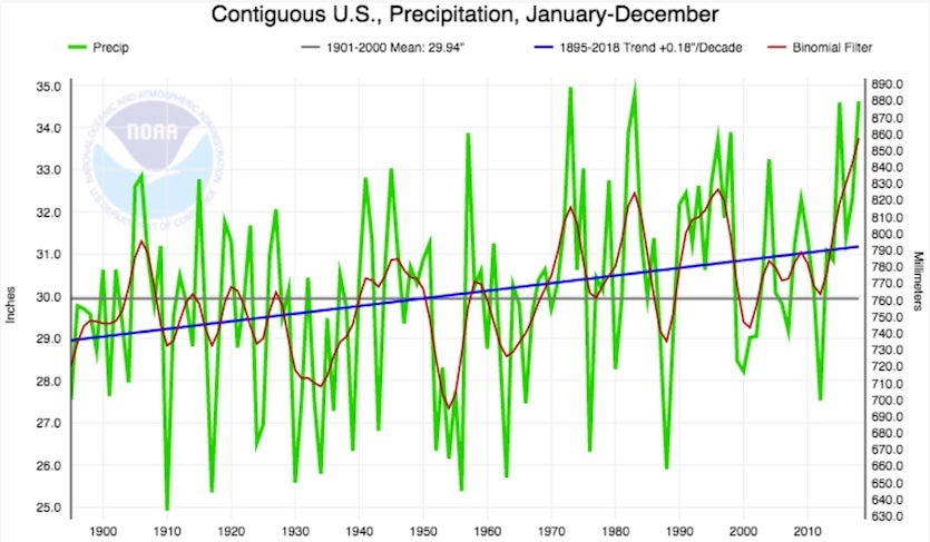 USA plosny prumer srazek v palcich 1901-2000 a linearni trend 1895-2018 (plosny prumer v palcich). Vypada to na vzestup o 7% v poslednim stoleti, az podezrele dost v uzemi souvislem USA mimo Alasku a Havaj.<br />Zdroj:<br />https://www.wunderground.com/cat6/Wettest-12-Months-US-History