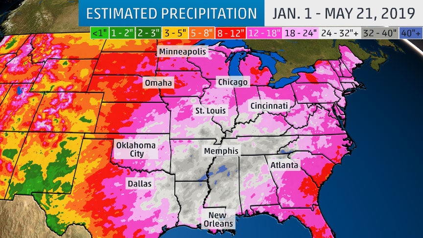 Za obdobi 01.01.2019-21.05.2019 byl extremni srazkovy uhrn v teple oblasti, jiho-vychod USA podel Misissippi, ne uplne na pobrezi, s uhrny 24-32+ palcu (610-812+ mm) na rozsahle oblasti velikosti cca Francie, k tomu na severu a horach talo velke mnozstvi snehu. Povodne na rece Missisippi jsou nejdelsi v moderni historii, dele trvajici nez v roce 1927 a asi i s vetsim prutokem v rece. Potreti v historii je otevrena vypust organza Spillway. Povodnove stavy az extremni jsou prez stred USA od pobrezi na jihu az nedaleko hranice s Kanadou.