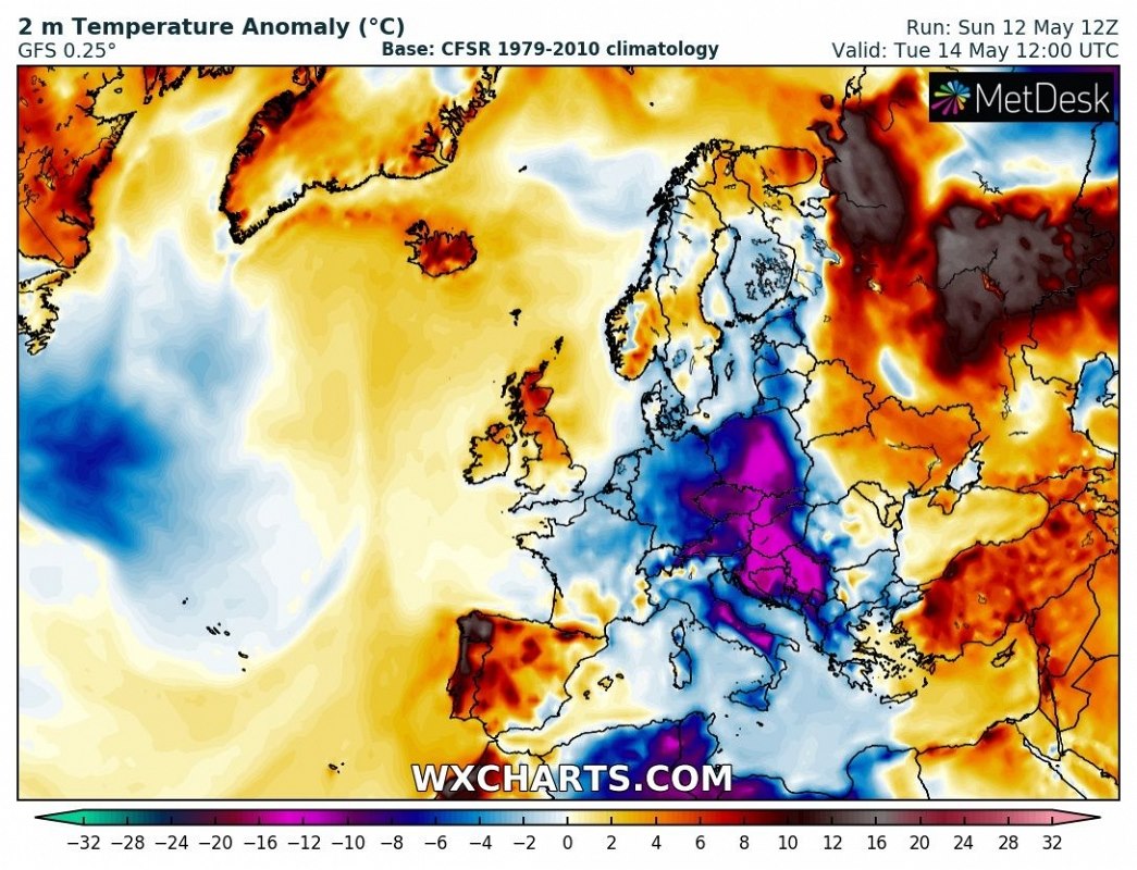 Anomalie aktualni teploty ve 2 m v Evrope od prumeru 1979-2010 14.05.2019 12 UTC (14 SELC), predpoved z behu modelu 12.05.2019 12 UTC, zdroj puvodni wxcharts.com, obrazek na lidovky.cz