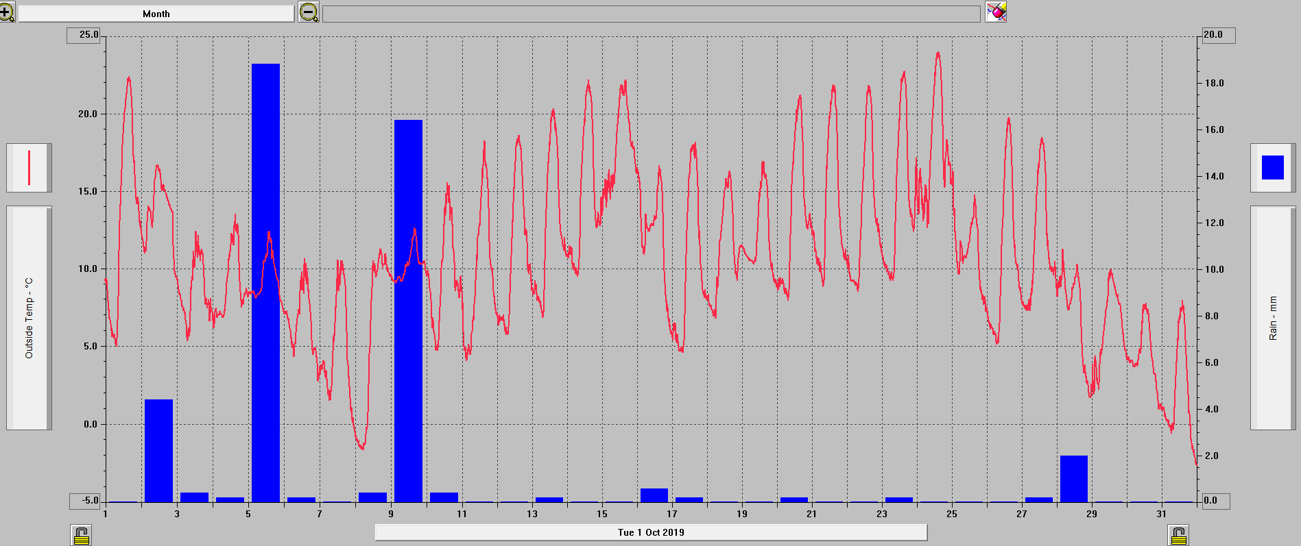 - maximální tlak 1029,5 hPa (30.10. v 10:49), minimální tlak 1000,2 hPa (2.10. v 7:21)