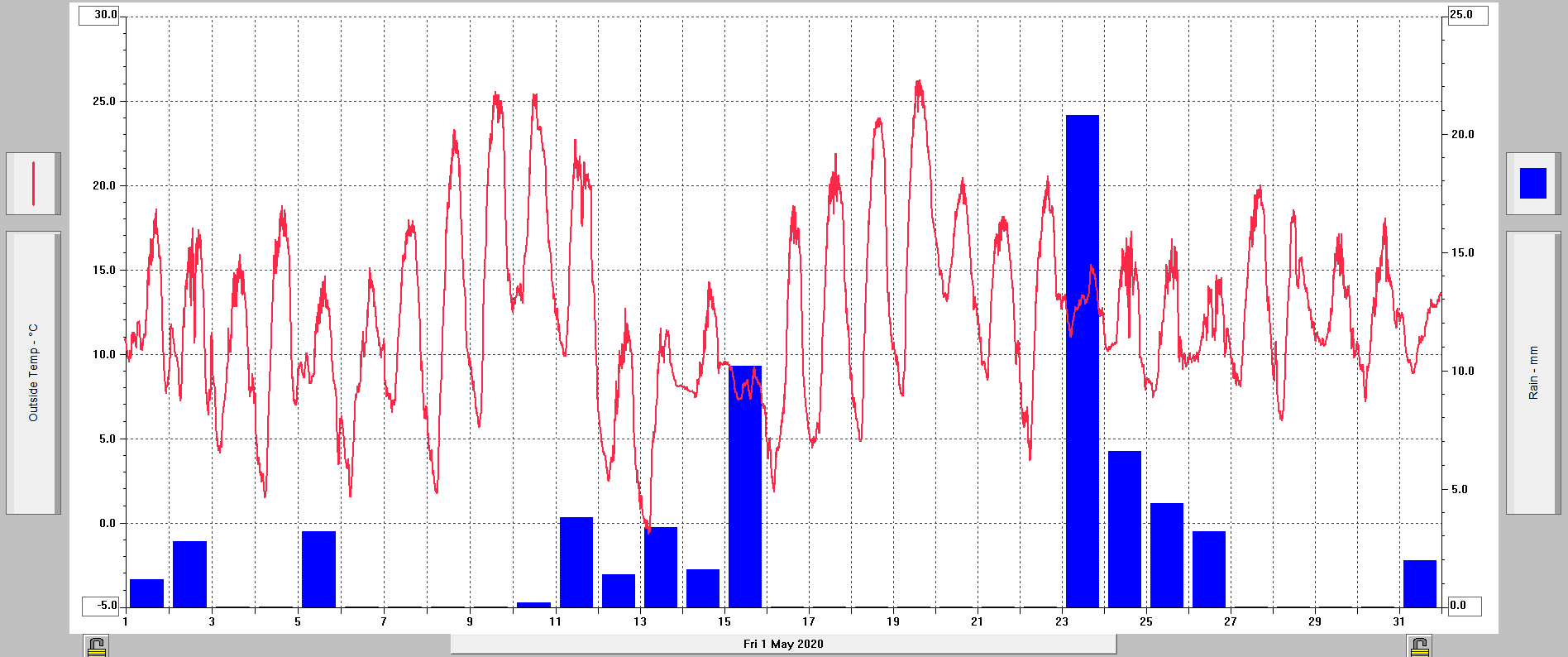 - maximální tlak 1032,7 hPa (27.5. v 1:12), minimální tlak 994,9 hPa (11.5. v 16:18)