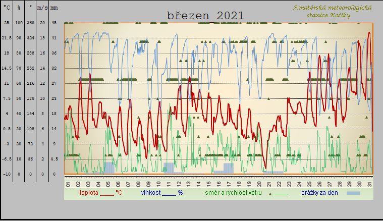 - nejteplejším dnem byl 31.3. s průměrnou denní teplotou + 10,55°C