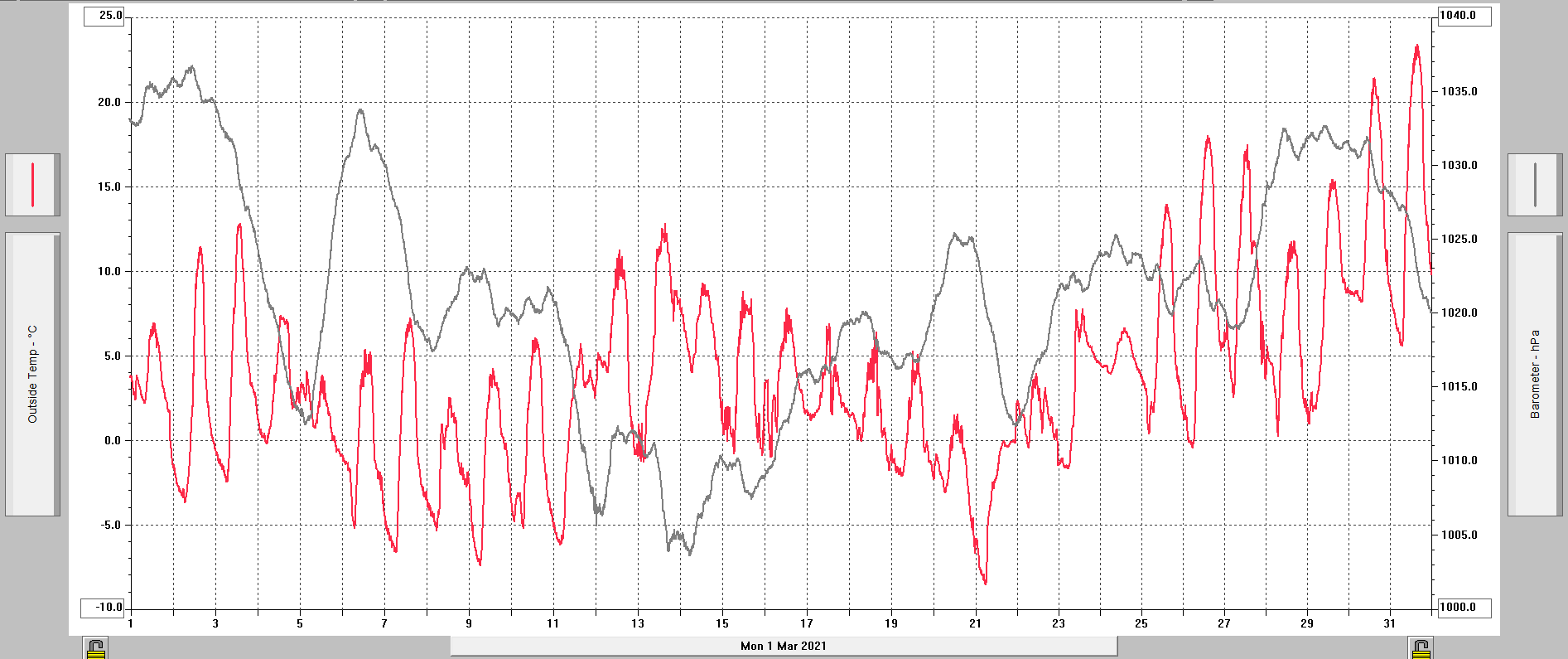 - maximální tlak 1036,0 hPa (1.3. v 11:15), minimální tlak 999,2 hPa (13.3. v 18:26)