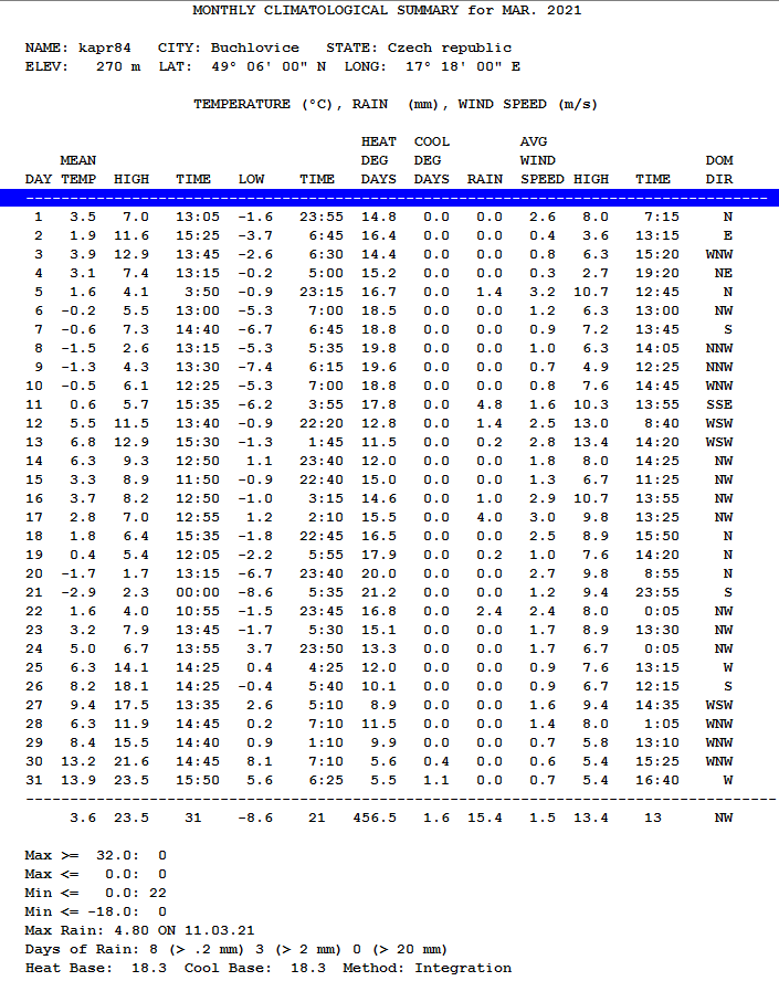 - nejchladnějším dnem byl 20.3. s průměrnou denní teplotou - 3,85°C
