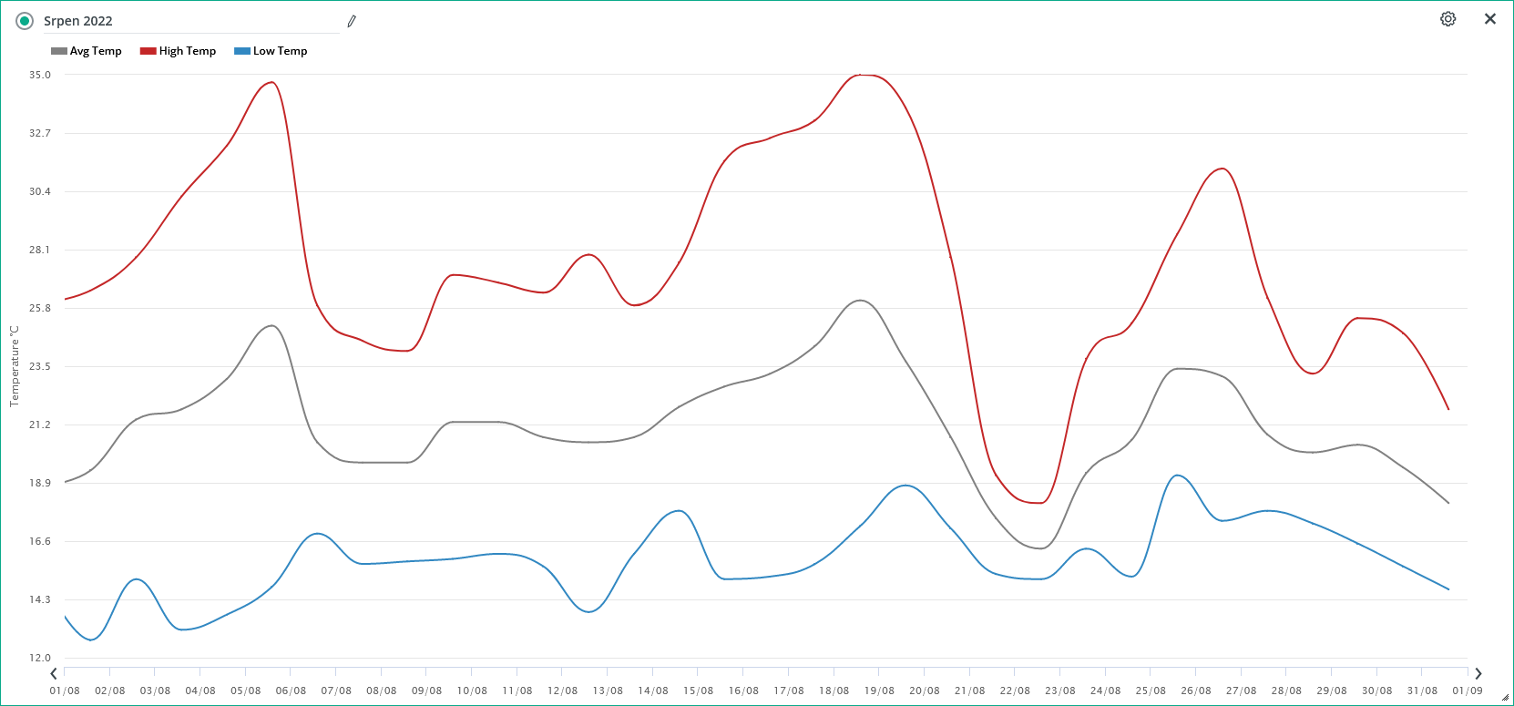 Prumerna teplota +20.54 °C (5. srpna +26.5 °C, 22. srpna +15.7 °C). Prumerny deficit rosneho bodu (Prumerna teplota - Prumerny rosny bod) 7.44 °C.
