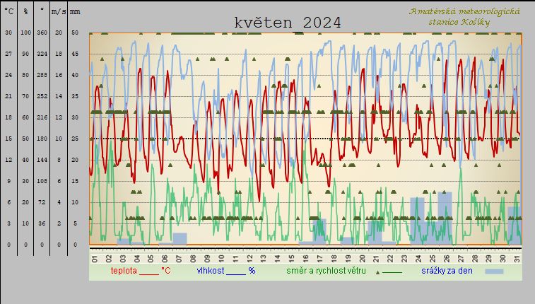 Shrnutí počasí za Košíky ,,květen 2024“ Měsíc jako celek na tomto sledovaném místě a za toto období vyšel : teplotně nadprůměrný a srážkově podprůměrný