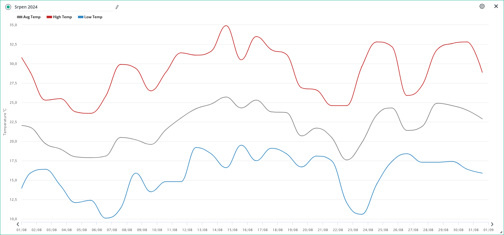 max.T: + 34,6°C 15.7. 2023, max. prům den.T + 27,2°C 16.8. 2024