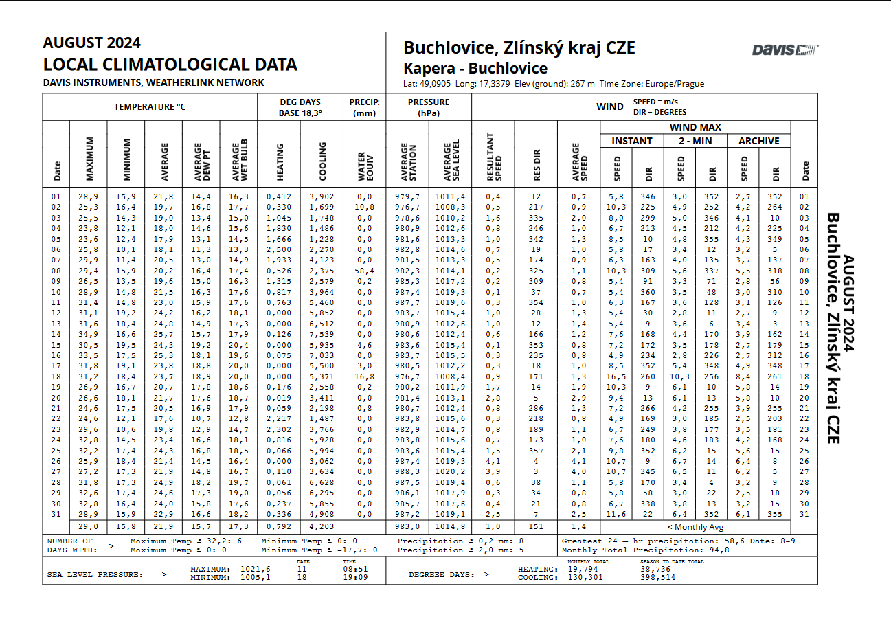 - průměrná teplota v 8:00 činila + 16,38°C - 3. nejteplejší srpen od roku 1996 (po 2015 a 2018)