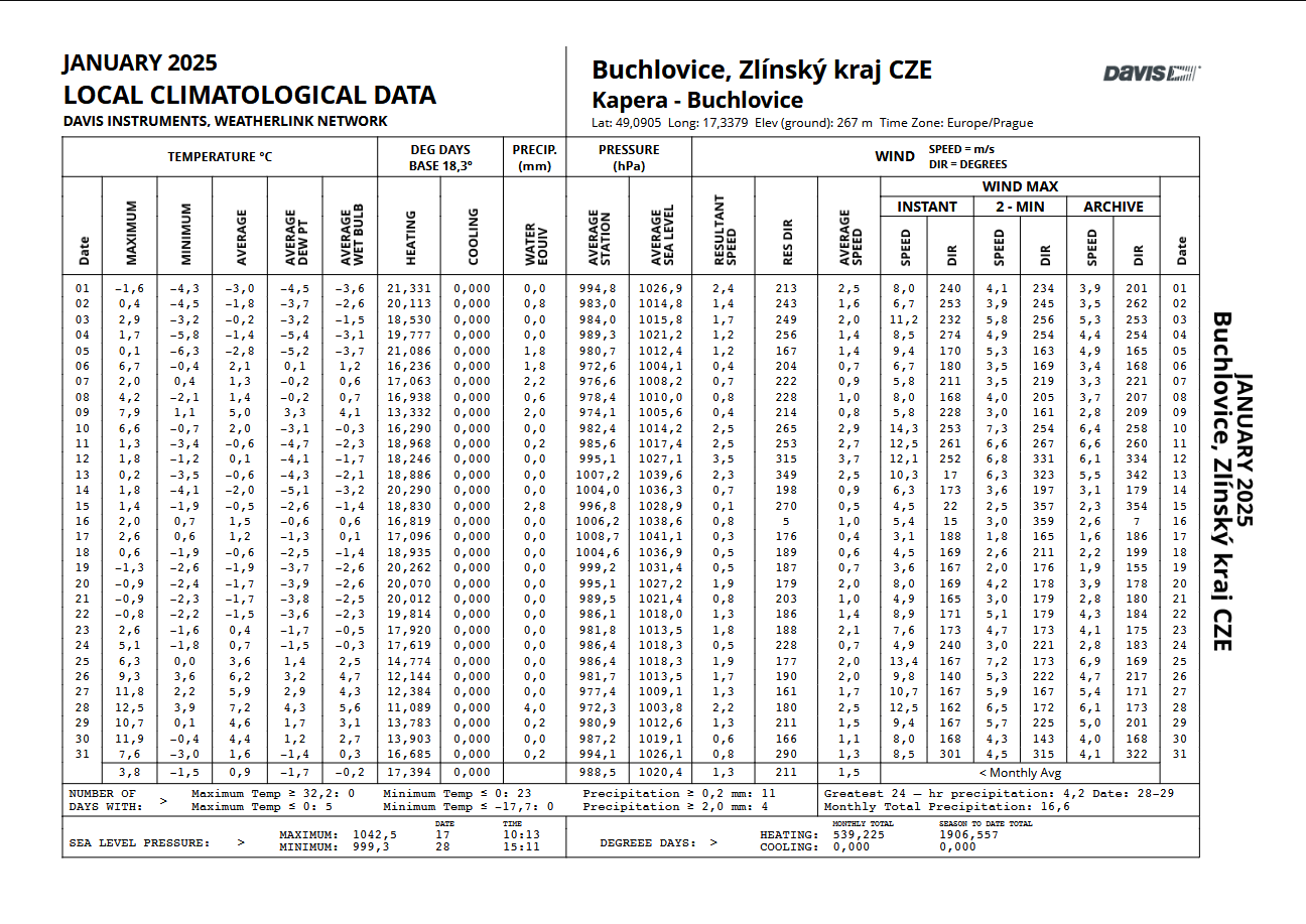 - maximální tlak 1042,3 hPa (13.1. v 11:00), minimální tlak 995,6 hPa (9.1. ve 20:55)