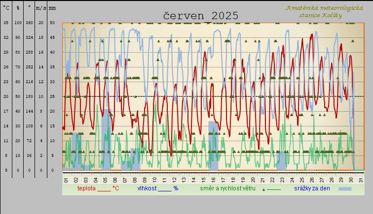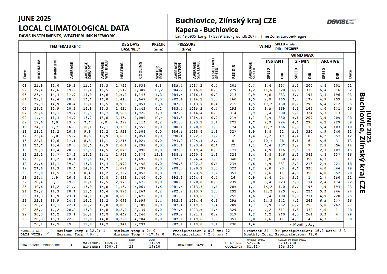- maximální rychlost větru: 5,8 m/s z azimutu 332° (SZ) dne 23.6. v 18:22 SELČ