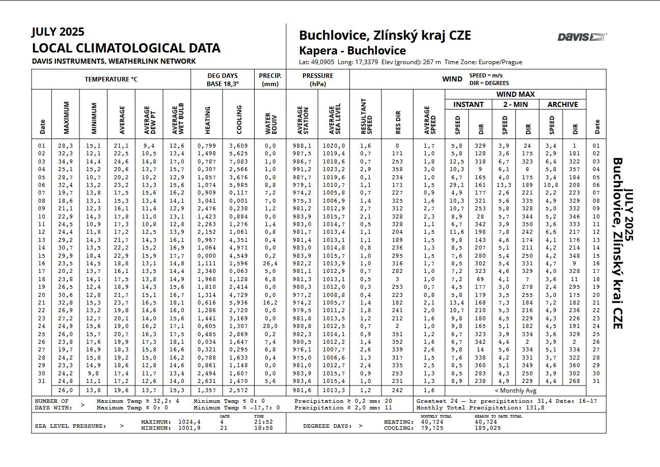 První měsíc dovolených a letních prázdnin se mohl jevit jako deštivý a chladný, to první lze označit kladně, druhé ale už nikoliv. Pokud začneme množstvým srážek, tak těch spadlo v červenci nejvíce od začátku pozorování v roce 2010. Podíl tedy činil 168 % průměru 2011-2020, když budeme brát data ze staničního srážkoměru. Podle davisáckého srážkoměru dosáhl hodnoty 188 %. Po teplotní stránce skončil letošní červenec ale jako normální, byť se zápornou odchylkou od normálu 2001-2020, ten činí 20,5 °C. Po většinu měsíce převládal severní, respektive západní vítr. Z pohledu extrémů je nutno zmínit náraz větru 29,1 m/s (105 km/h) dne 6. během bouřky. Jedná se nejvyšší zaznamenaný náraz za dobu měření od roku 2007. Takže z pohledu dlouhodobého sledování zažíváme teplotně ukázkové průměrné léto. Alespoň dle prvních dvou měsíců.. Co přinese srpen?