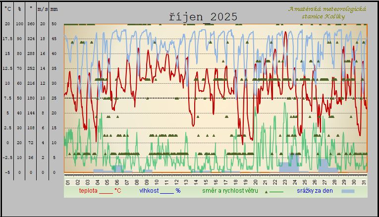 Shrnutí počasí za Košíky ,,říjen 2025“ Měsíc jako celek na tomto sledovaném místě a za toto období vyšel : teplotně i srážkově nadprůměrný