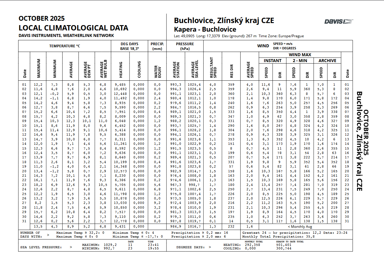- absolutně nejnižší teplota byla dosažena dne 20.10. - 3,6°C v 6:43 SELČ
