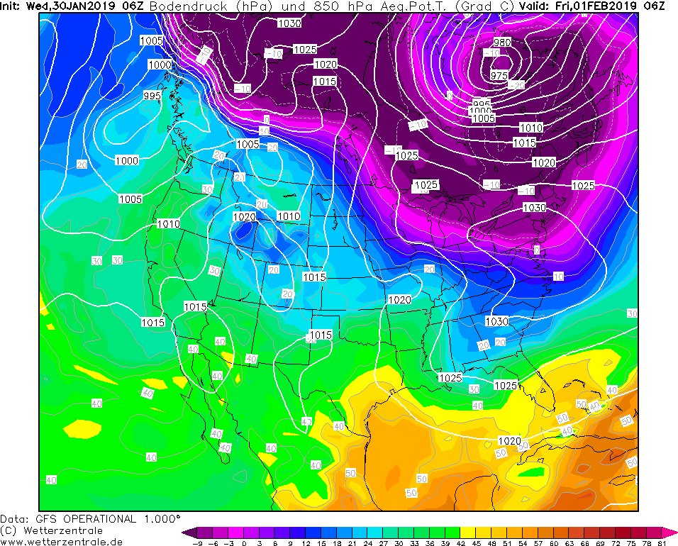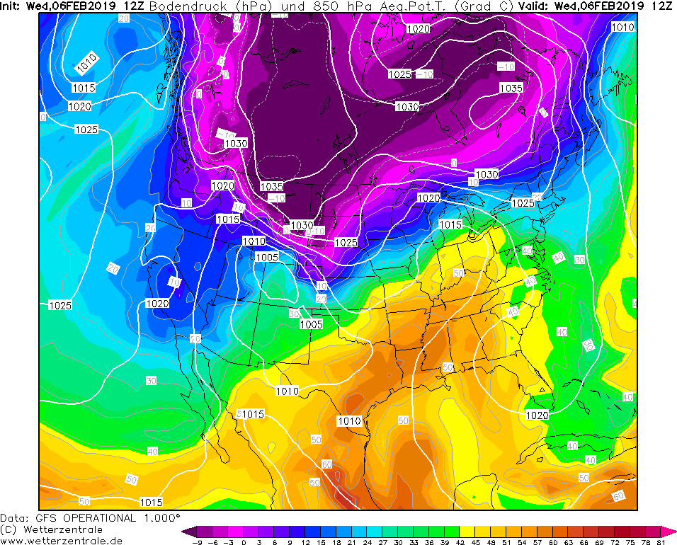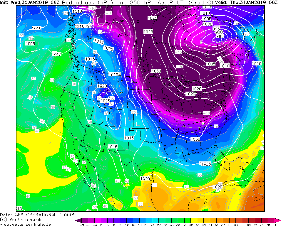 Model GFS Wetterzentrale 30.01.2019 06 UTC ThetaE v 850 hPa a prizemni tlak redukovany na hladinu more.