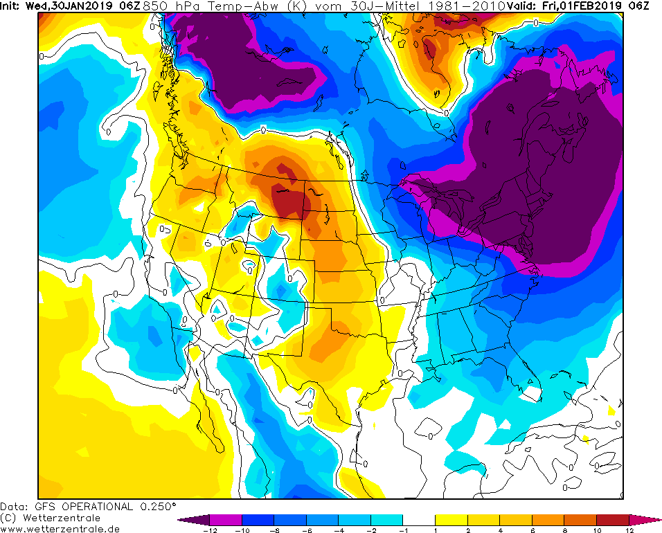 Model GFS Wetterzentrale 30.01.2019 06 UTC Odchylka teploty v 850 hPa od normalu 1981-2010.