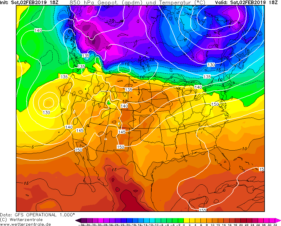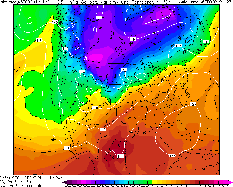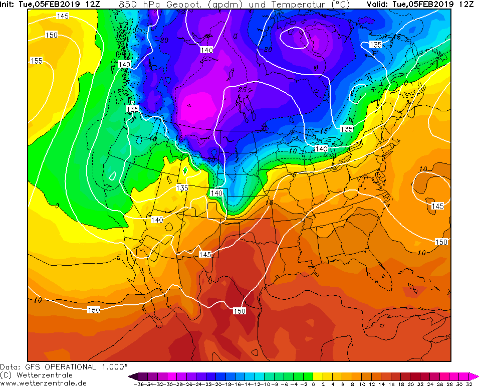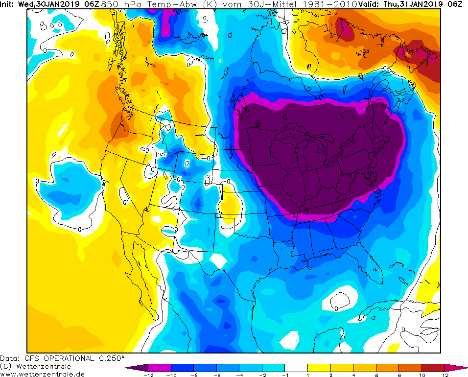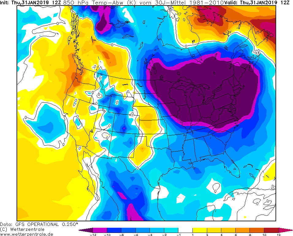 Model GFS Wetterzentrale - 31.01.2019 12 UTC Odchylka teploty v 850 hPa od normalu 1981-2010.