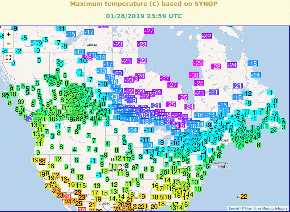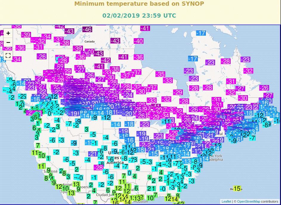 Chicago 42 stupnu severne, jako kousek severne od Rima pod -30 °C a i Super-Arkticky den s Tmax pod -20 °C. To v Klementinu byly jen 4 takove dny od roku 1775 a nikdy nebylo v Klementinu pod -30 °C (nejnize 01.03.1785 -27.6 °C).