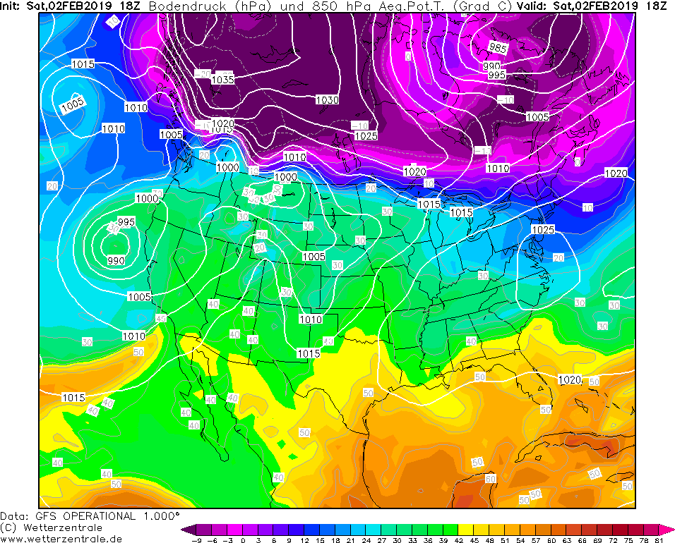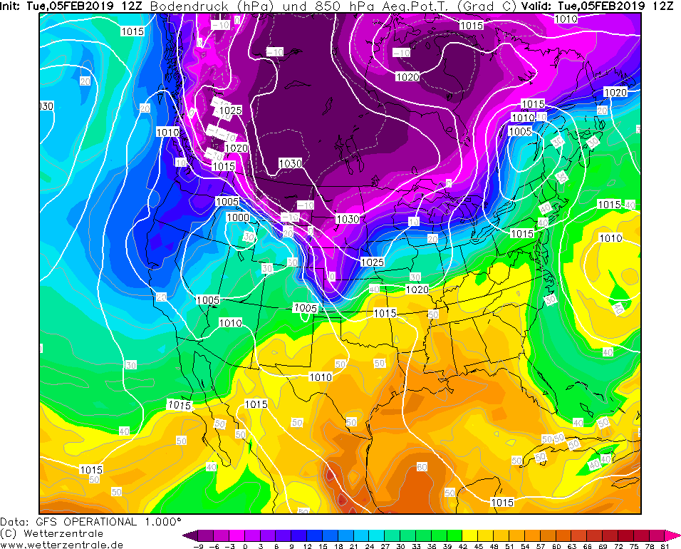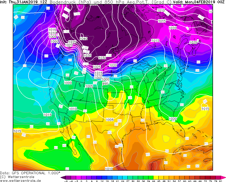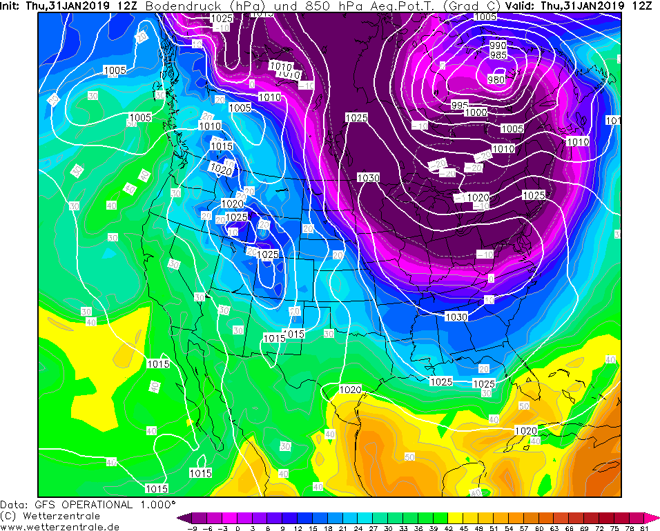 Model GFS Wetterzentrale - 31.01.2019 12 UTC ThetaE v 850 hPa a prizemni tlak redukovany na hladinu more.