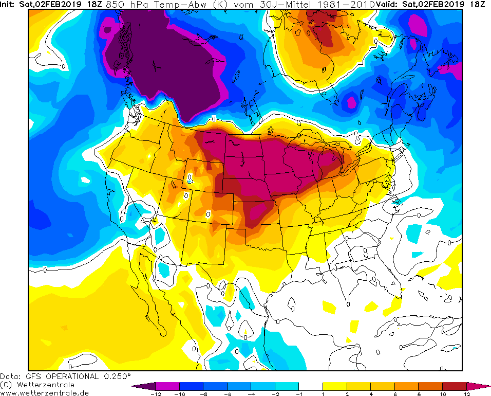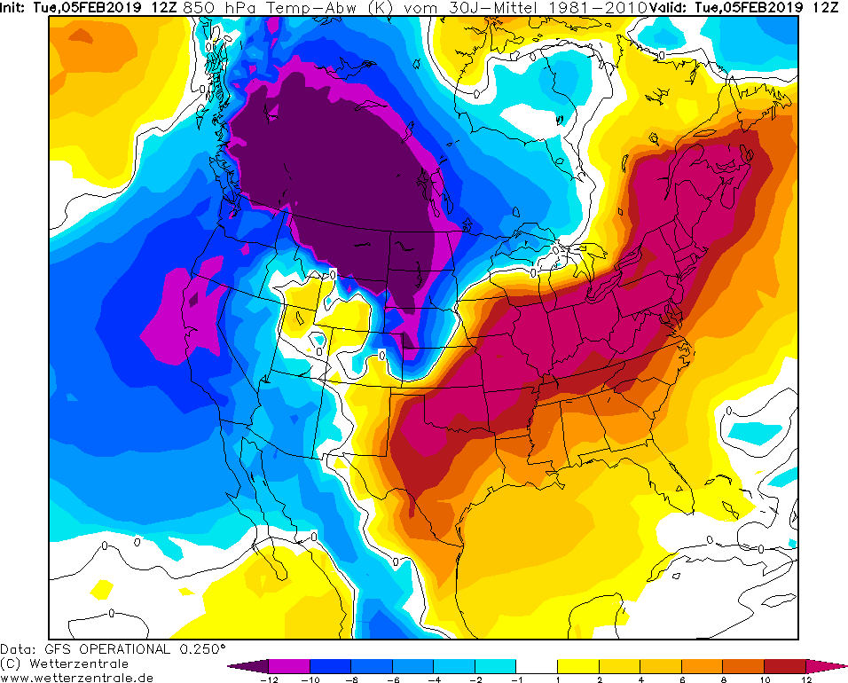 I dalsi dny budou zajimave. Aktualne jsou v severni Americe dve rozsahle oblasti s extremnim nadprumerem a extremnim podprumerem (odchylka od normalu vic nez +12 °C a mene nez -12 °C). A to se jedna o rozsahle oblasti.