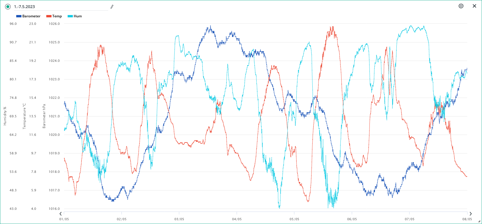 Minimální/maximální tlak 7.5.: 1017,1 hPa /1025,3 hPa