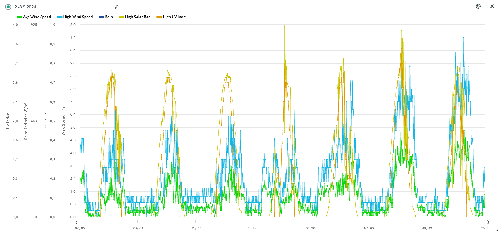 Maximální průměrná rychlost za 24h: 5,3 m/s (7.; 13:10) (145°)