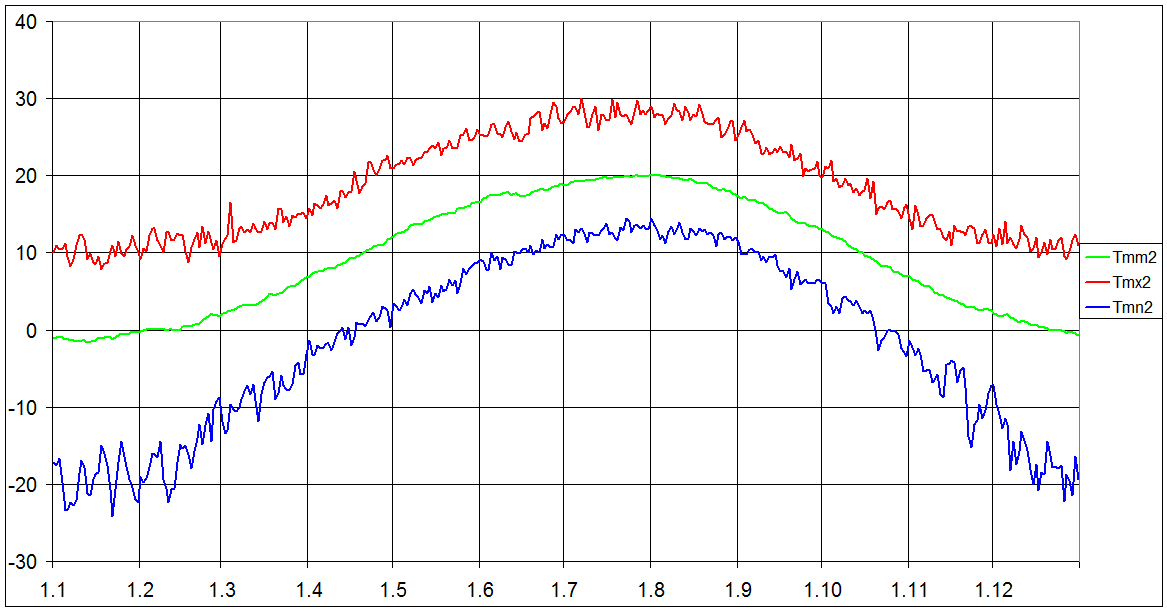 Hodnoty jsou za cele obdobi 1775-2004, pro kazdy den v roce. Pro 29.02. bylo dat mene. Bash pocita z ceymi cisly, tak desetina carka byla odstranena a hodnoty zadavany jako cela cisla (z +26.9 stupne byl vstup 269, z -27.6 par -276 a pod.). Vypocet trva 2-5 dni podle sily CPU.