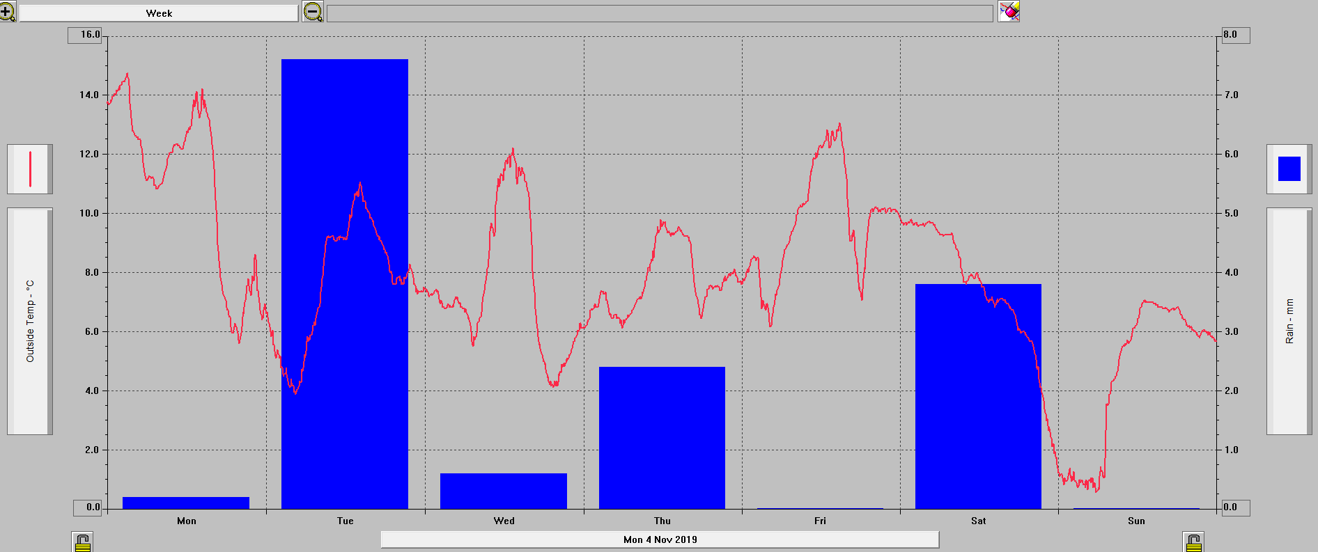 Zataženo, slabý déšť, 8/8, sc, ns; teplota 8,0 °C; rosný bod 6,8 °C; relativní vlhkost vzduchu 92 %; vítr bezvětří; tlak vzduchu, přepočtený na hladinu moře 1007,0 hPa, mírný pokles; solární radiace 5 W/m2; windchill 8,0 °C; THSW index 6,8 °C.