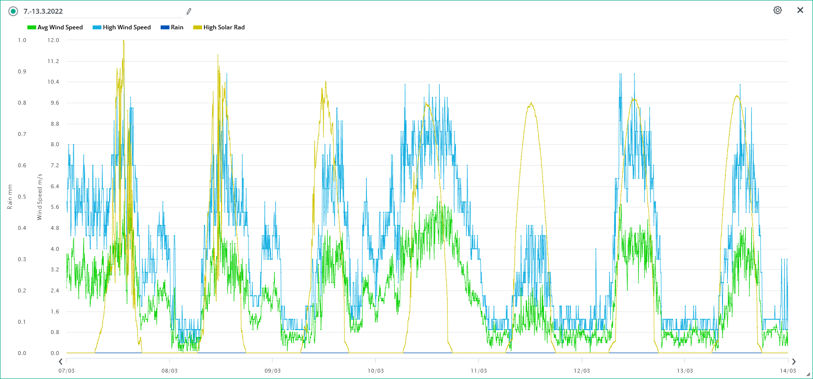 Průměrná rychlost větru 13.3./ max. rychlost.: 2,6 m/s (VJV)/ 8,0 m/s (VJV) 16:40 SEČ
