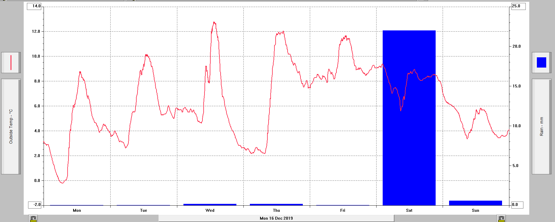 Minimální/ maximální teplota 21.12.: +4,6°C (23:59)/ +7,9°C (13:15)