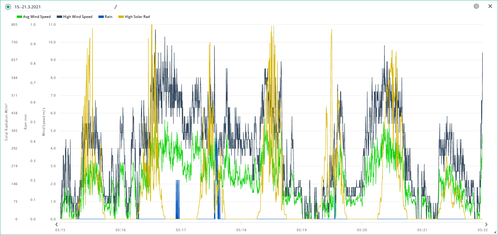 Průměrná rychlost větru 21.3./ max. rychlost.: 2,3 m/s (Z)/ 8,5 m/s (SZ) 23:10 SEČ