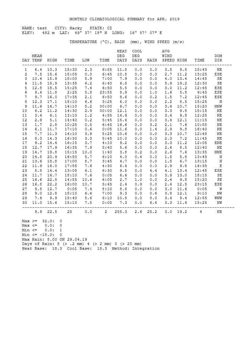 - nejsilnější náraz větru zaznamenán: 11,6 m/s z azimutu 180°(J) 4.4. ve 13:51 SELČ