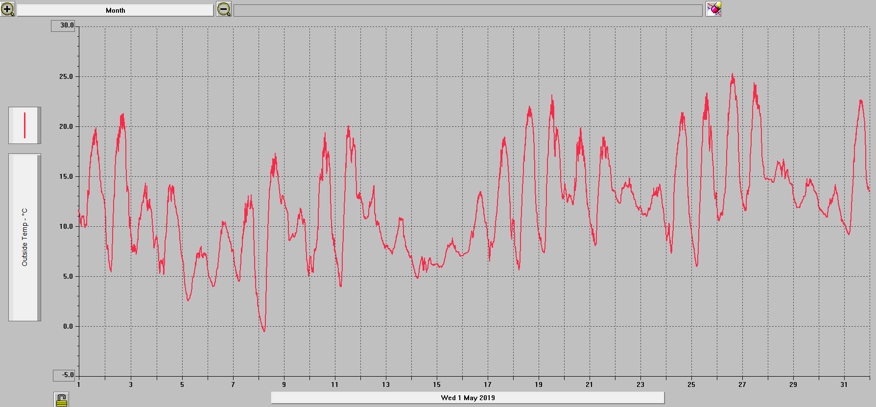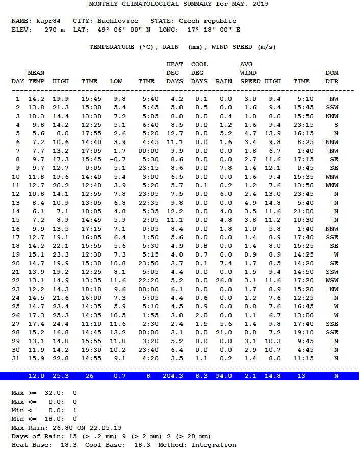 - absolutně nejvyšší teplota byla dosažena dne 19.5. + 25,2°C v 16:21 SELČ