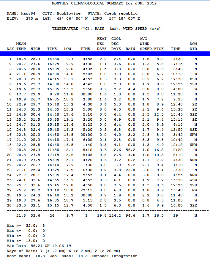 - nejsilnější náraz větru zaznamenán: 11,2 m/s z azimutu 180°(J) 15.6. v 19:59 SELČ