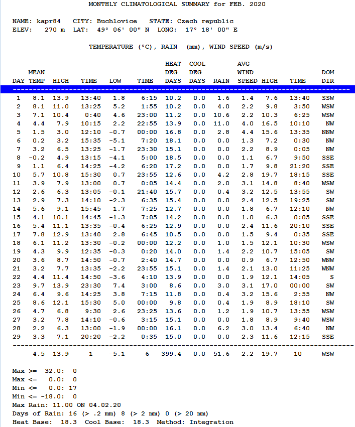 - nejchladnějším dnem byl 5.2. s průměrnou denní teplotou - 0,67°C