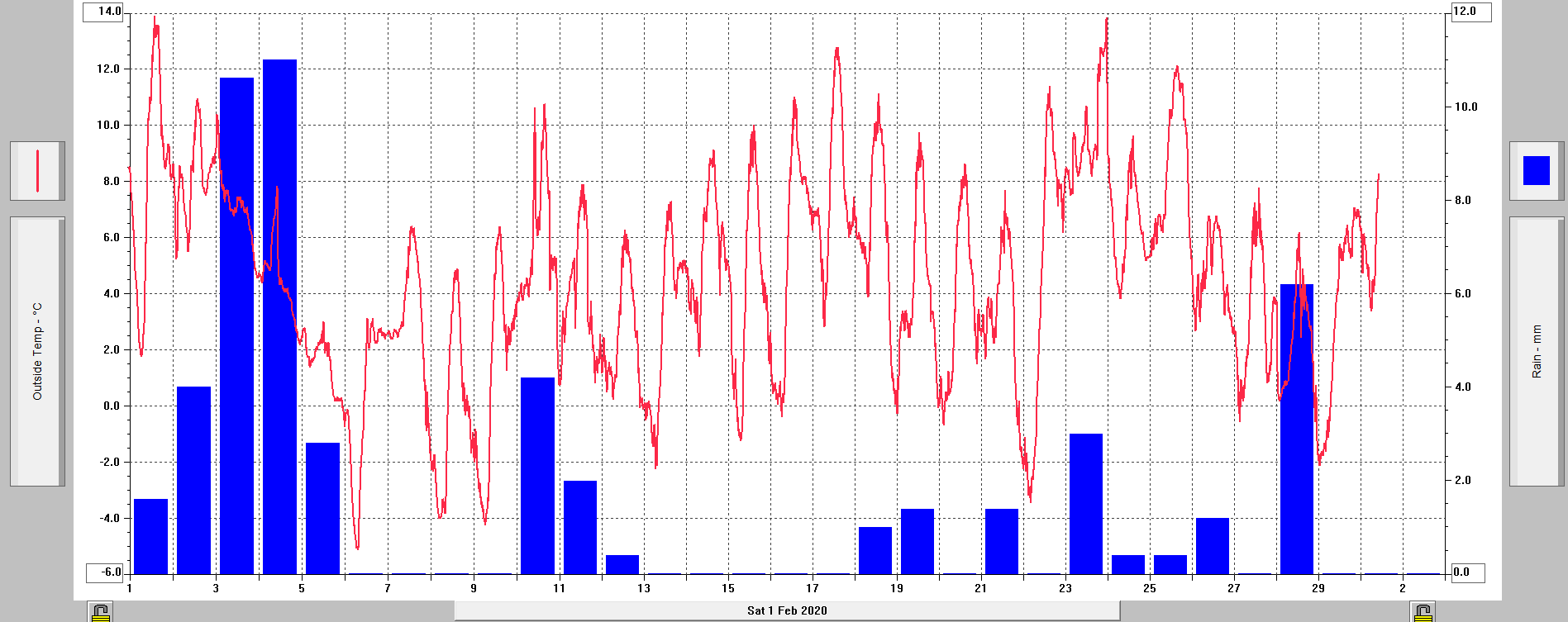 - maximální tlak 1032,0 hPa (5.2. ve 23:02), minimální tlak 992,4 hPa (11.2. ve 2:32)