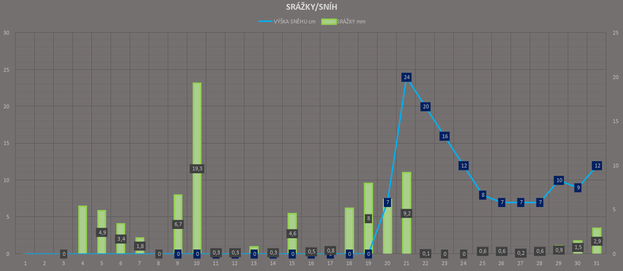 Uhrn srazek za leden 12.8 mm tedy prumerne 0.41 mm denne. (21. ledna 2.1 mm, 11. ledna 1.9 mm, 8 dni zcela beze-srazek). Jedna se o podprumerny uhrn srazek.