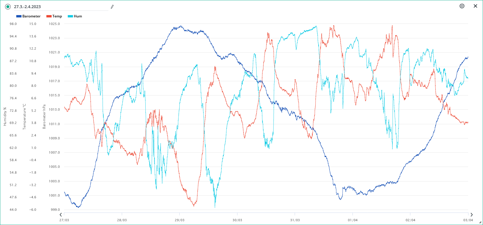 Minimální tlak vzduchu na stanici za 24h: 968,9 hPa (31.3.; 18:45)