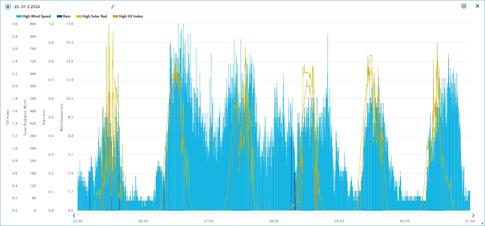 25.-31.3. vítr, srážky, sluneční záření, UVI