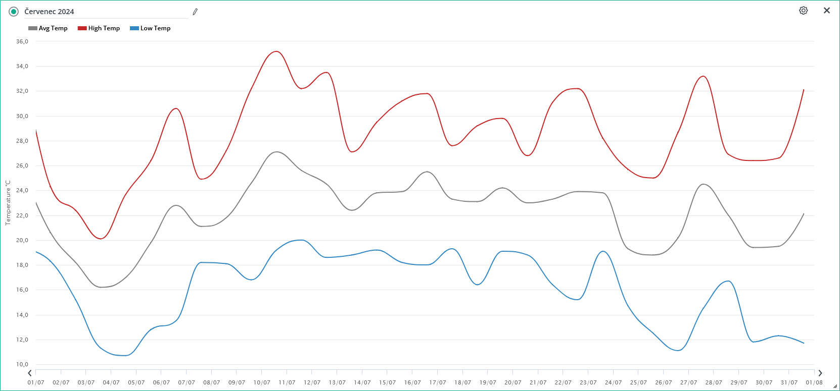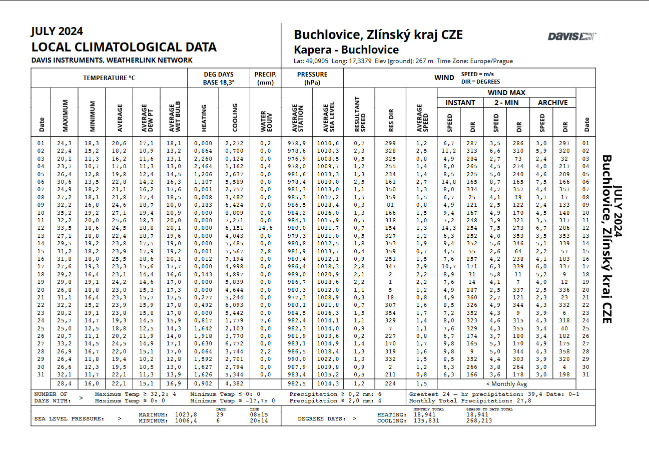 max.T: + 34,6°C 15.7. 2023, max. prům den.T + 27,2°C 16.8. 2024