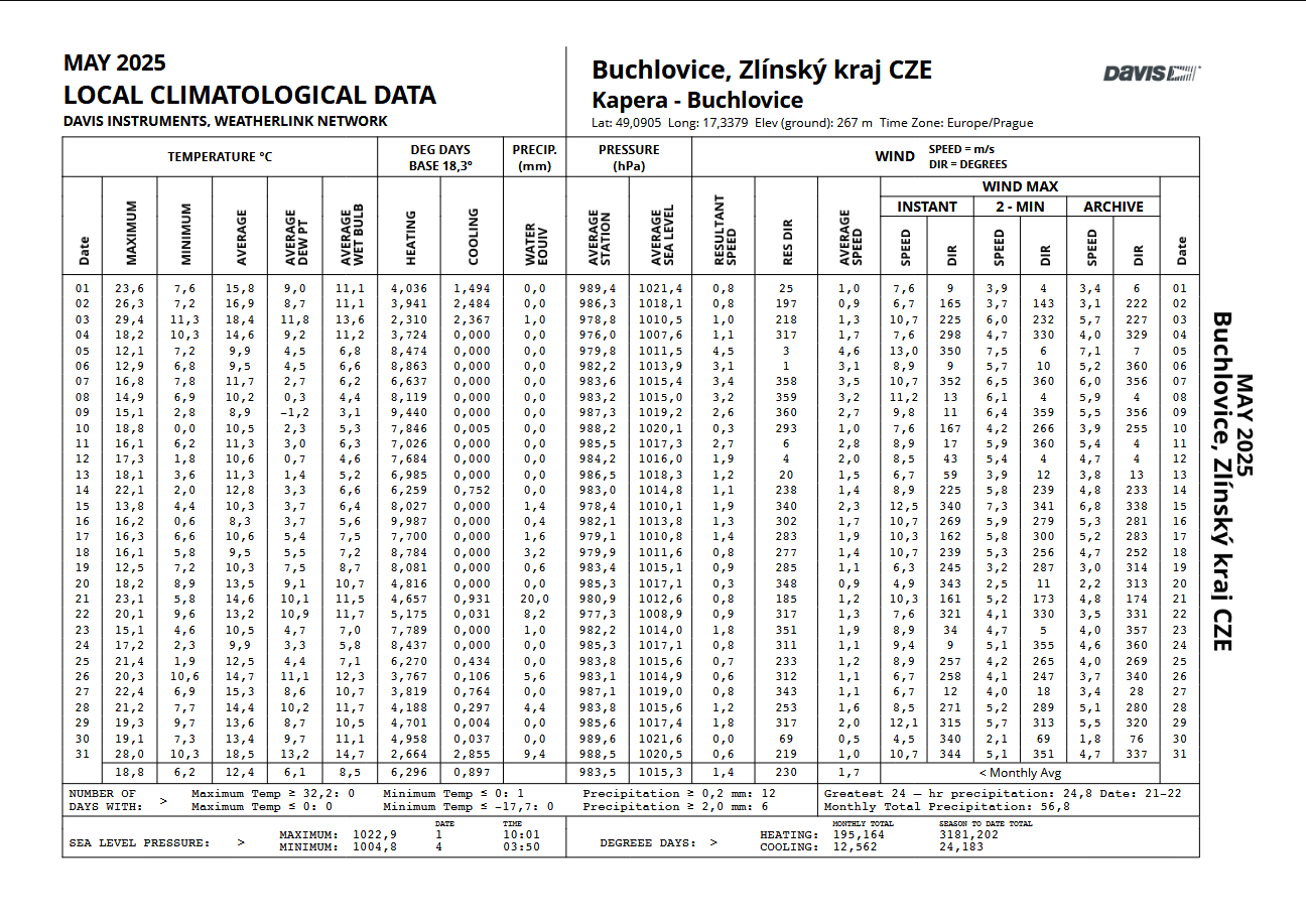 - nejsilnější náraz větru zaznamenán: 10,3 m/s z azimutu 342° (S) dne 15.5. ve 14:46 SELČ