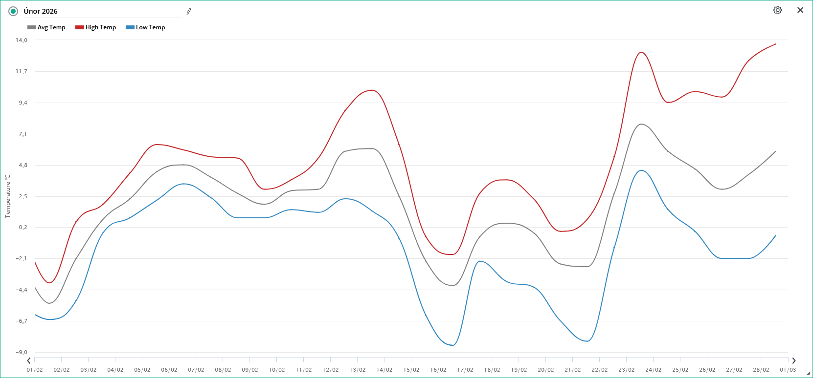 - absolutně nejvyšší teplota byla dosažena dne 27.2. + 13,2°C ve 14:34 SEČ