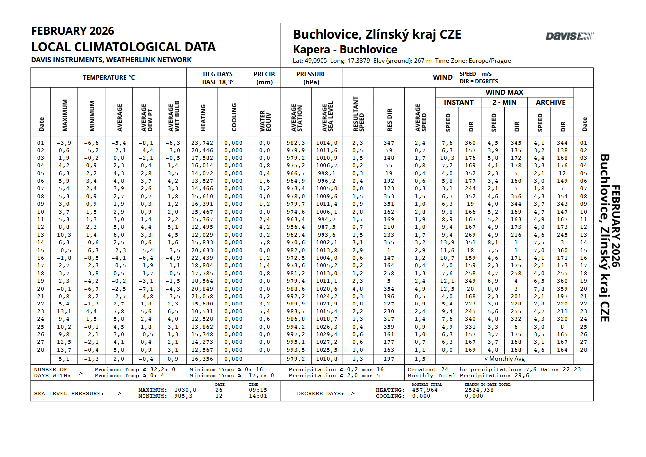 - nejsilnější náraz větru zaznamenán: 7,6 m/s z azimutu 270°(Z) dne 13.2. v 1:20 SEČ